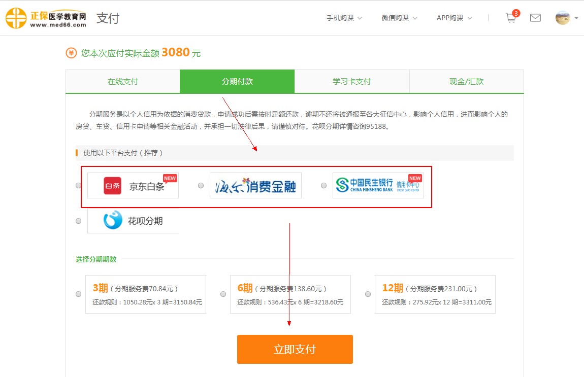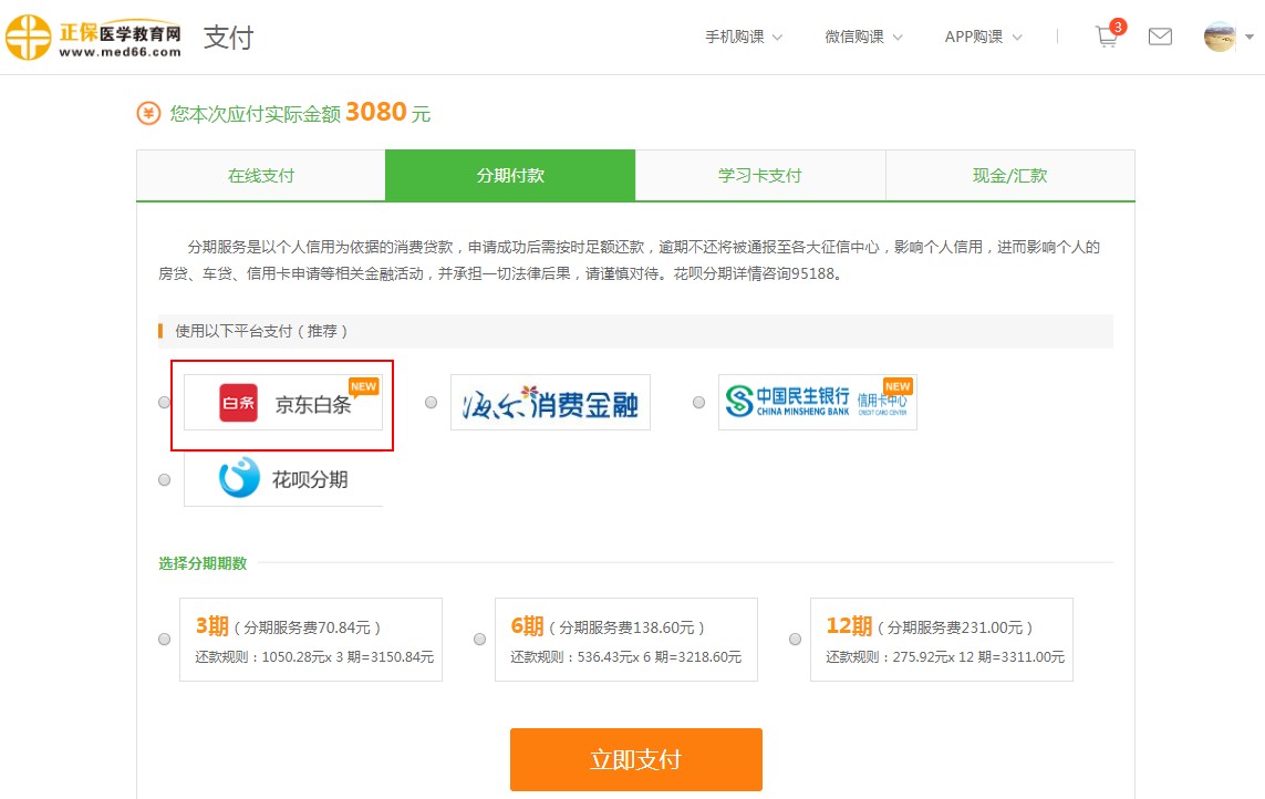 第三步:在支付頁面,選擇分期付款可選擇京東白條進(jìn)行支付,就能享受滿減優(yōu)惠啦!