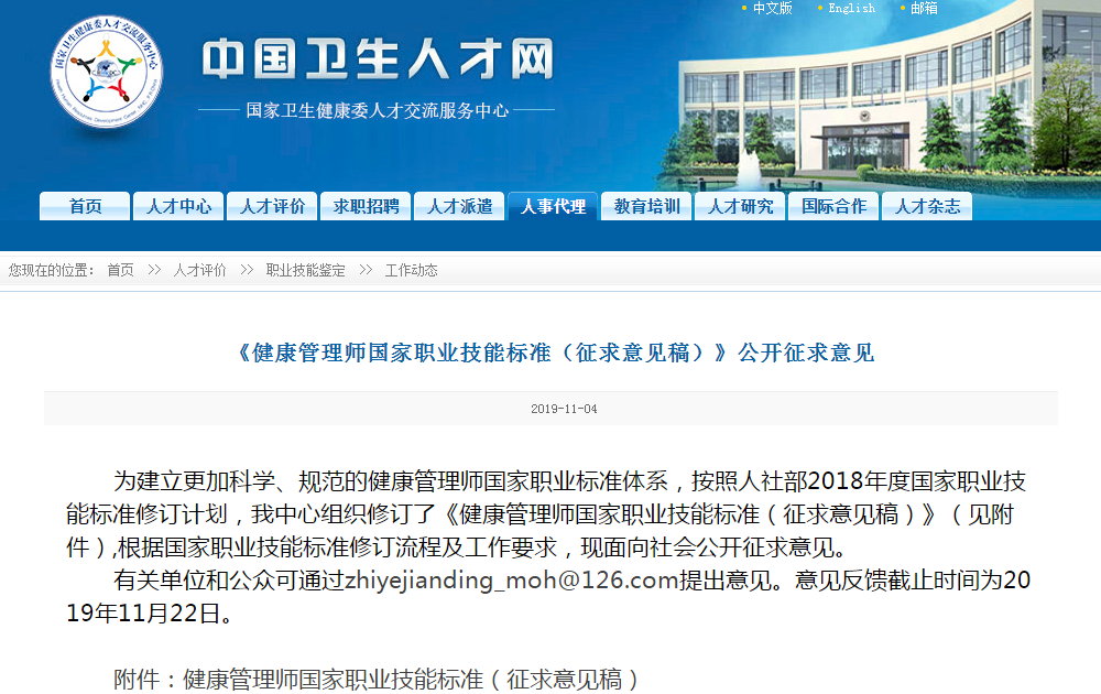 11月4日,中國衛(wèi)生人才網(wǎng)發(fā)布了《健康管理師國家職業(yè)技能標準(征求意見稿)》,根據(jù)國家職業(yè)技能標準修訂流程及工作要求,面向社會公開征求意見。公告申明:有關(guān)單位和公眾可通過zhiyejianding_moh@126.com提出意見,意見反饋截止時間為2019年11月22日。