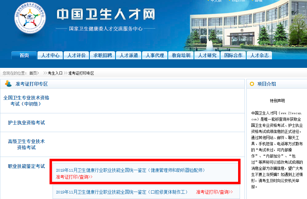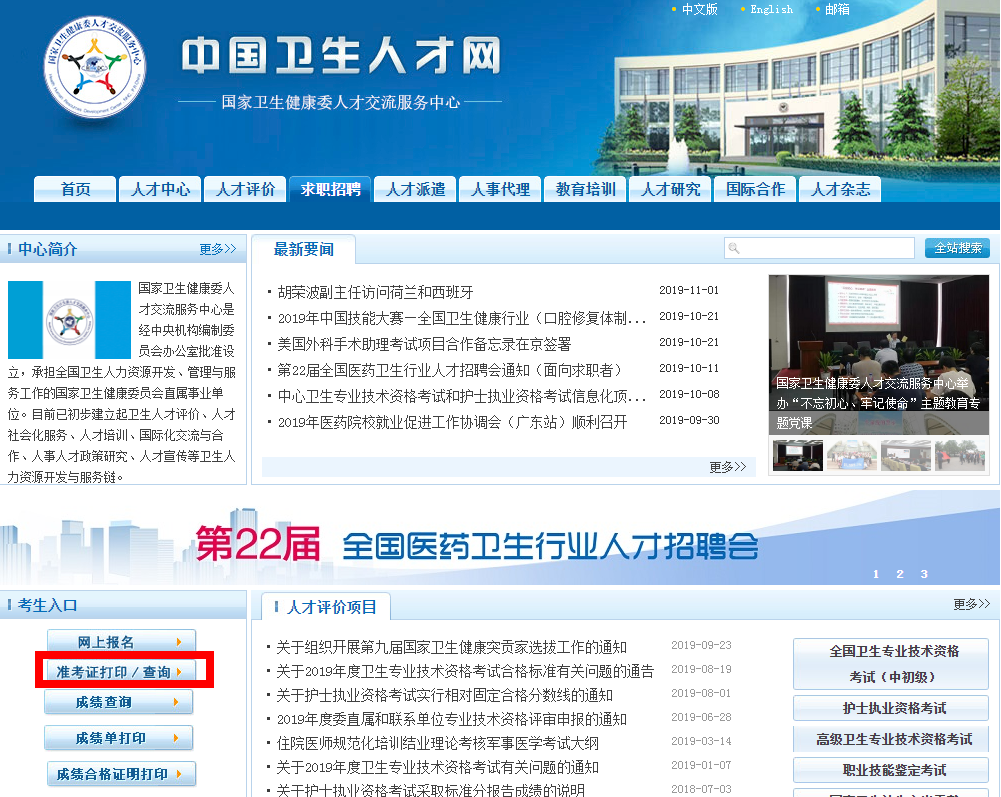 1、登錄中國衛(wèi)生人才網(wǎng)(http://www.21wecan.com),選擇“首頁”中的【準(zhǔn)考證打印/查詢】;