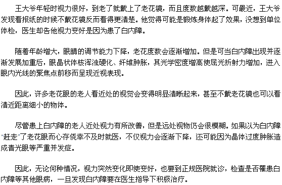 隨著人們年齡的增加,老花眼是老年人群中時(shí)?;加械?,但是當(dāng)患有老花眼的朋友們,突然老花眼好了。大家就要留心,也許是白內(nèi)障干的。下面就由醫(yī)學(xué)教育網(wǎng)小編來(lái)為大家詳細(xì)介紹為什么白內(nèi)障能讓老花眼突然變好吧。