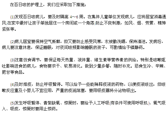 俗話說:“三分治病,七分護(hù)理。”對于百日咳的病兒也是如此,如果護(hù)理得當(dāng),病兒會較快康復(fù);反之,就可能導(dǎo)致嚴(yán)重的并發(fā)癥,危急生命,有的雖然渡過了危險(xiǎn)期,但留下了難以消失的后遺癥。所以,耐心和科學(xué)地護(hù)理就顯得特別重要。