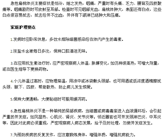 在平時(shí),如果我們生病了除了及時(shí)到醫(yī)院檢查治療外,還可以通過(guò)一些生活方面的小措施來(lái)減輕我們身體的疼痛。下面小編帶大家一起來(lái)看看得了急性扁桃體炎的患者朋友可以通過(guò)哪些家庭護(hù)理方法來(lái)減輕疾病帶來(lái)的不適感吧。