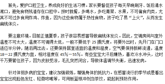 有很多家長抱怨自己的寶寶老是扁桃體發(fā)炎,有時寶寶扁桃體發(fā)炎的話還會引起各種疾病,所以家長都很擔(dān)心。就想各種方法給寶寶預(yù)防,那么寶寶如何預(yù)防扁桃體發(fā)炎?下面小編來給大家介紹一下。