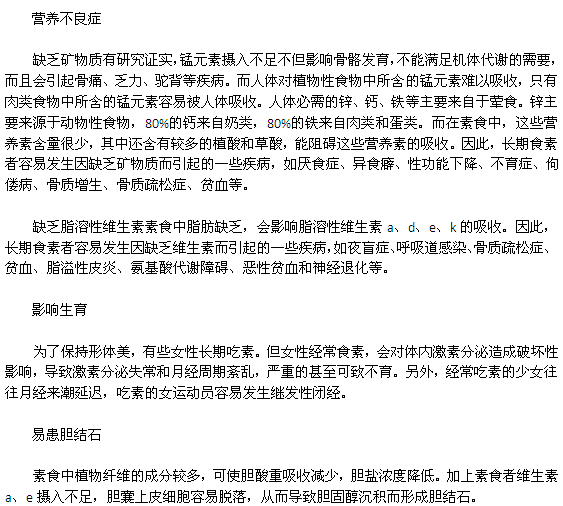 女性經(jīng)常食素,會(huì)對(duì)體內(nèi)激素分泌造成破壞性影響,導(dǎo)致激素分泌失常和月經(jīng)周期紊亂,嚴(yán)重的甚至可致不育。隨著人們生活水平的不斷提高,人們開始認(rèn)識(shí)到過(guò)度食入大魚大肉等油膩食物,可能會(huì)催生許多疾病,因此,有的人終年不吃肉。事實(shí)上,單純的素食會(huì)導(dǎo)致食物成分比例失調(diào),同樣會(huì)引起一些疾病,女性經(jīng)常食素,會(huì)對(duì)體內(nèi)激素分泌造成破壞性影響,導(dǎo)致激素分泌失常和月經(jīng)周期紊亂,嚴(yán)重的甚至可致不育。