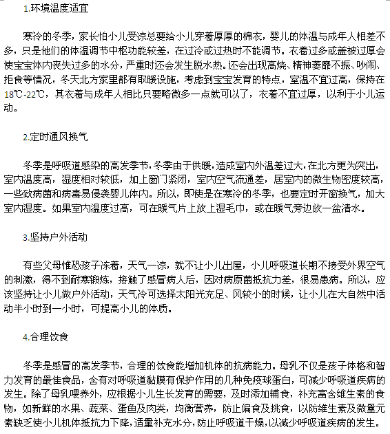 冬季是嬰幼兒感冒高發(fā)的季節(jié),北京婦產(chǎn)醫(yī)院新生兒科副主任醫(yī)師馬雅玲提醒,小兒過冬要注意把好衣食住行等方面。尤其要把握四原則,預(yù)防孩子患上感冒。