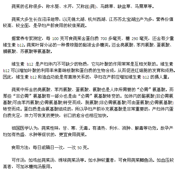 孕媽媽的飲食對于寶寶的健康非常有影響,那么孕期吃什么對寶寶最好呢?想必這是大家都很關心的問題,所以今天我們的小編就為大家簡單的介紹一下,孕媽媽多吃莼菜可增強造血功能。