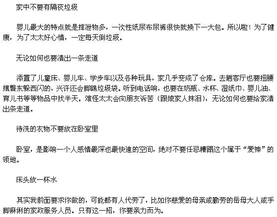 因?yàn)榭偸堑胗浿o寶寶換尿布、喂水喂奶、太太的睡眠質(zhì)量非常不好。而一個(gè)長(zhǎng)期缺覺(jué)的人,定是個(gè)火冒三丈的人。對(duì)她說(shuō):“寶貝,我尋到一個(gè)祖?zhèn)髅胤?,說(shuō)一個(gè)人睡眠不好,是因?yàn)榇差^有火,腦袋和神經(jīng)無(wú)法冷卻下來(lái)造成的。”用一只美麗的瓷懷盛滿冰水放在床頭。然后每天睡覺(jué)前把水換新,這樣放一兩個(gè)星期,就會(huì)有效果。趕快試試吧!反正一杯冷水也不用多少錢(qián)。太太也會(huì)因你的癡心而開(kāi)心。