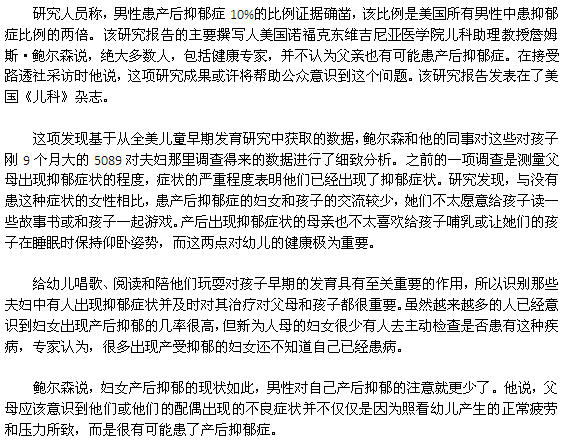 美國的研究人員在一份最新報(bào)告中指出,婦女患產(chǎn)后抑郁并不為怪,很多剛做父親的男性也會(huì)患產(chǎn)后抑郁。在對(duì)美國5000對(duì)剛剛做父母的夫婦進(jìn)行的一項(xiàng)調(diào)查表明,14%的母親和10%的父親出現(xiàn)了嚴(yán)重產(chǎn)后抑郁癥。根據(jù)過去的研究,患病婦女的比例在意料范圍內(nèi),但對(duì)父親患產(chǎn)后抑郁癥的情況則知之甚少。