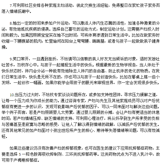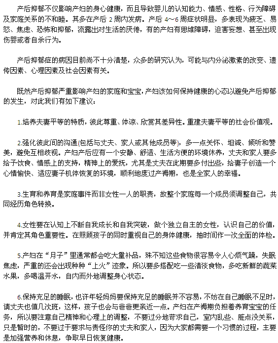 產(chǎn)婦在產(chǎn)后會出現(xiàn)一些心理負(fù)擔(dān),如不及時疏導(dǎo),很容易發(fā)生心理障礙。出現(xiàn)了這種抑郁情緒,除了不利于家人的相處,還會影響正常哺乳,甚至影響孩子的生長以造成嚴(yán)重的后果。因此,產(chǎn)婦應(yīng)保持健康的心態(tài),從生活中尋找樂趣,做一個健康快樂的媽媽。