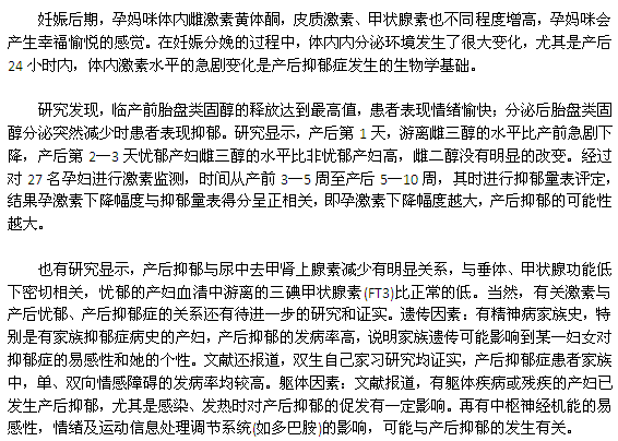 產(chǎn)后抑郁癥是一種常見的女性精神障礙疾病,許多女性在產(chǎn)后會出現(xiàn)孤獨、煩躁、自責等情緒,研究表明,大約有70%的女性在產(chǎn)后都會出現(xiàn)不同程度的抑郁癥,這個數(shù)字隨著經(jīng)濟的發(fā)展和生活水平的提高會逐漸增長。導(dǎo)致產(chǎn)后抑郁的因素有很多,內(nèi)分泌變化就是其中原因之一,下面我們來了解一下。