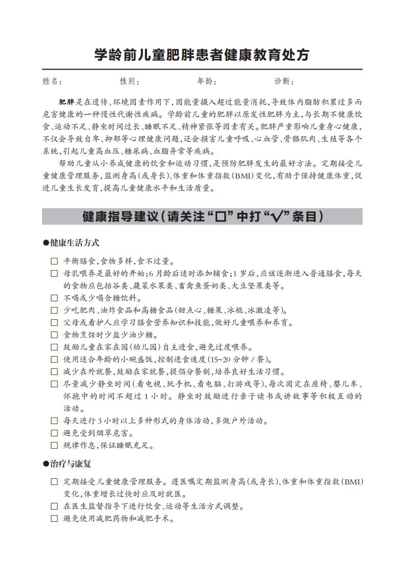 肥胖嚴(yán)重影響兒童身心健康, 不僅會(huì)導(dǎo)致自卑、抑郁等心理健康問(wèn)題,還會(huì)損害兒童呼吸、心血管、骨骼肌肉、生殖等各個(gè) 系統(tǒng),引起兒童高血壓、糖尿病、血脂異常等疾病。 幫助兒童從小養(yǎng)成健康的飲食和運(yùn)動(dòng)習(xí)慣,是預(yù)防肥胖發(fā)生的最好方法。定期接受兒 童健康管理服務(wù),監(jiān)測(cè)身高(或身長(zhǎng))、體重和體重指數(shù)(BMI)變化,有助于保持健康體重,促 進(jìn)兒童生長(zhǎng)發(fā)育,提高兒童健康水平和生活質(zhì)量。