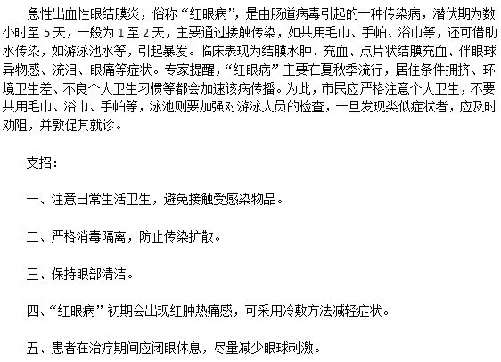 隨著8月份“秋老虎”的到來,天氣將仍保持高溫、炎熱和干燥的特點,這一季節(jié),除了常規(guī)的腸道、乙腦等傳染病外,還要特別注意“紅眼病”,注意個人衛(wèi)生,外出旅游時注意防蚊。