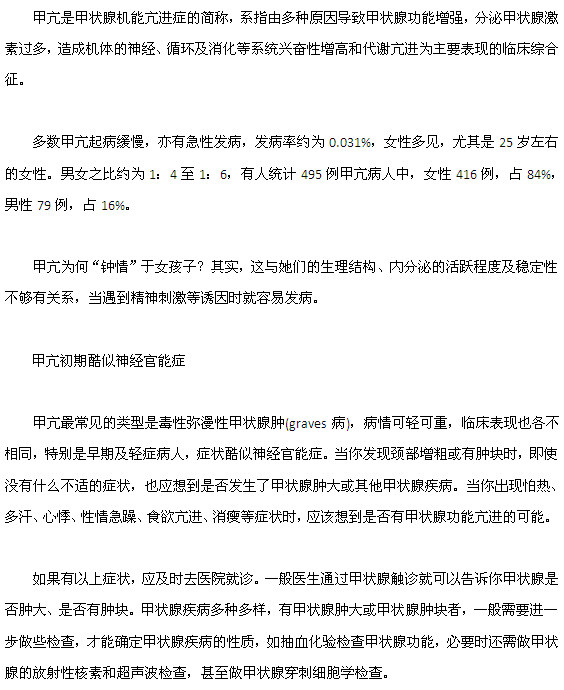 您知道嗎?甲亢一般鐘情于年輕女性,想知道這是怎么一回事嗎?相信您看了這篇有關(guān)甲亢的文章,您就了解了。