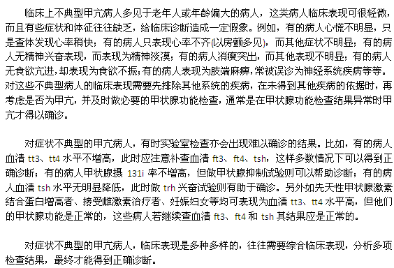典型的甲亢從臨床表現(xiàn)和實(shí)驗(yàn)室檢查結(jié)果不難作出診斷,但是不典型甲亢無(wú)論從臨床表現(xiàn)還是從實(shí)驗(yàn)室檢查結(jié)果來(lái)看,都給正確診斷帶來(lái)一定困難。那么如何識(shí)別不典型甲亢呢?下面小編帶您了解下。