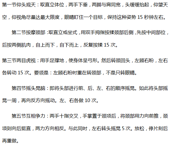 頸部及背部的椎間盤(pán)因失去彈性而變得脆弱,很容易發(fā)生破裂。小編介紹一套頸部保健操,可使頸部活動(dòng)靈活有力,頸部皮膚不松弛,對(duì)防治頸椎病,肩周炎等疾病有良好療效。