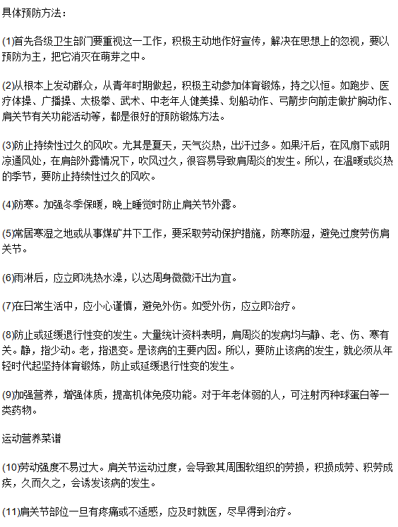 肩周炎的發(fā)生有氣血不足,肩關(guān)節(jié)及其周圍組織發(fā)生退行性變的內(nèi)因,導(dǎo)致不通而痛。能夠內(nèi)外因相結(jié)合地預(yù)防該病就一定能減少該病的發(fā)生,醫(yī)學(xué)教育網(wǎng)編輯為你整理一些可以預(yù)防肩周炎的方法,希望對有幫助。