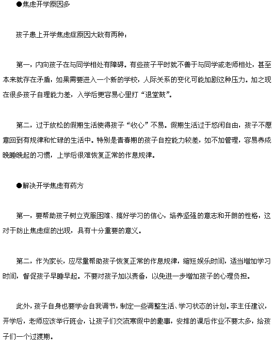 當(dāng)前,開學(xué)焦慮癥已經(jīng)并不陌生,尤其在開學(xué)前夕,開學(xué)焦慮的癥狀更加明顯。您想知道開學(xué)焦慮癥的原因是什么嗎?如果患上了開學(xué)焦慮癥又要如何治療呢?相信您看了這篇文章,您就了解了。