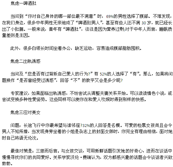 在大多數(shù)人心目中,男人是強者的代名詞。然而,這些鐵打的“硬漢”卻常常被社會壓力和家庭責任搞得疲憊不堪。日前,美國《男性健康》雜志對其全球男性讀者的一項調查結果顯示:男人們內心的焦慮普遍來自十個方面,其中有三個比較關鍵。除了“衰老”、“工作枯燥”、“啤酒肚”,“出軌誘惑”、“應對美女”也讓他們苦惱。那么,造成這些困擾的深層次原因到底是什么?究竟采取哪些對策,這些煩惱才會迎刃而解呢?