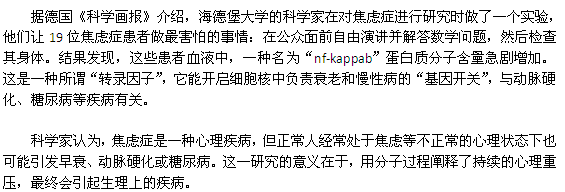 “焦慮催人老”這句俗話并非沒(méi)有根據(jù)。德國(guó)科學(xué)家新近發(fā)現(xiàn),焦慮癥能開(kāi)啟人體內(nèi)促使細(xì)胞衰老的基因,進(jìn)而引發(fā)多種疾病。下面小編就帶您了解下焦慮癥是如何讓人變老的。