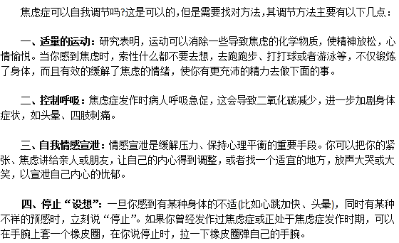 焦慮癥可以自我調(diào)節(jié),并且上文也已經(jīng)非常明白的為大家介紹清楚了焦慮癥的調(diào)節(jié)方法,我們需要從這些自我調(diào)節(jié)方法當中找到適合自己的方法,注意堅持,并且積極尋求幫助就可以很好的促使自身的病情穩(wěn)定。