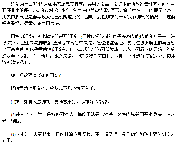 腳氣是由真菌感染引起的,而真菌具有傳染性,但是腳氣的傳染不只是傳到另一個人的腳上或者是手上,如果女人自己患有腳氣或者是伴侶患有腳氣甚至?xí)?dǎo)致女人患上陰道炎。