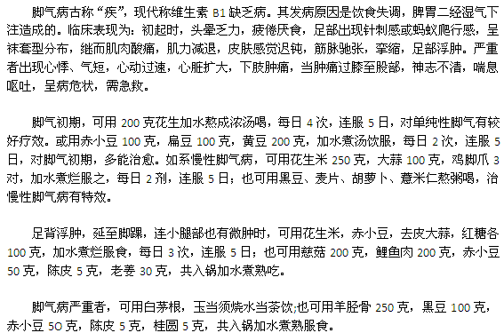 現(xiàn)代人患腳氣病,多數(shù)人是因為赤米越來越精,吃面越來越白,飲食上缺乏B族維生素。因此,預(yù)防腳氣病的最好辦法就是赤的主食不要太精細(xì),經(jīng)常吃含維生素B1豐富的糙米、粗雜糧、瘦肉、果仁、豆類食品;注意大便通暢;也可適當(dāng)服些維生素B1片或干酵母片等。