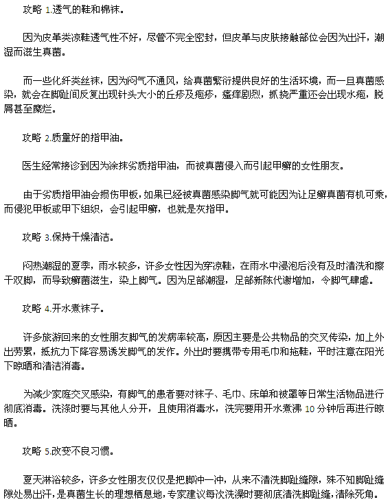 進(jìn)入夏季,正是所有愛美女性纖纖細(xì)足大展風(fēng)光的好時(shí)節(jié),但有不少女性朋友一到悶熱潮濕的夏天就開始為“腳”發(fā)愁——瘙癢、糜爛、蛻皮、長(zhǎng)水皰,讓人不勝其煩。下面小編給大家講講預(yù)防腳氣的5個(gè)攻略: