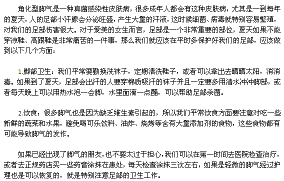 得了角化型腳氣的患者一定非常煩惱,尤其是女生。因?yàn)榻腔湍_氣會(huì)使患者的足部產(chǎn)生角化過度、干燥、皸裂、脫屑等癥狀,使我們的足部看起來非常的干,那么在我們的生活中應(yīng)該怎樣預(yù)防角化型腳氣呢?各位愛美的女性朋友快跟著小編一起來了解一下吧。