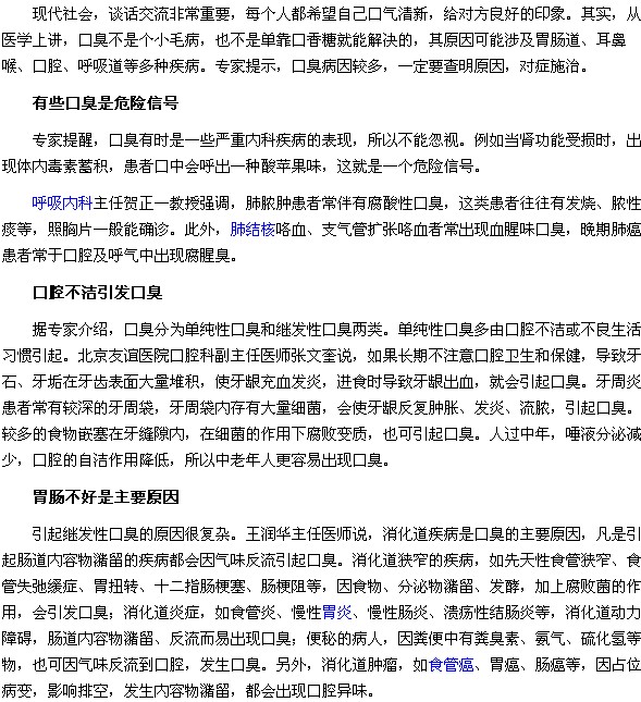 如果您或家人朋友患了口臭,相信這篇關于“口臭的危險信號:胃腸不好|口腔不潔都是引發(fā)口臭的原因”的文章會對您有幫助,醫(yī)學教育網(wǎng)編輯現(xiàn)將具體內容為大家介紹如下: