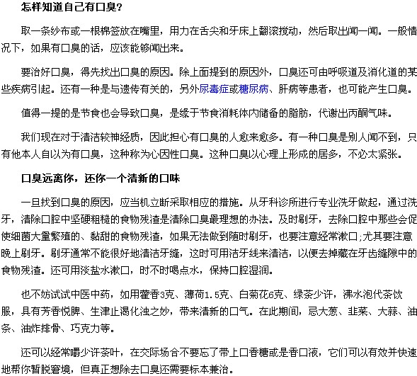 以上就是對(duì)“如何判斷自己是否患有口臭的疾病”內(nèi)容的介紹了,相信大家在看完之后一定已經(jīng)有所了解了,預(yù)防口臭,好的生活飲食習(xí)慣是必不可少的。在這里,小編希望大家都可以遠(yuǎn)離口臭,輕松生活。