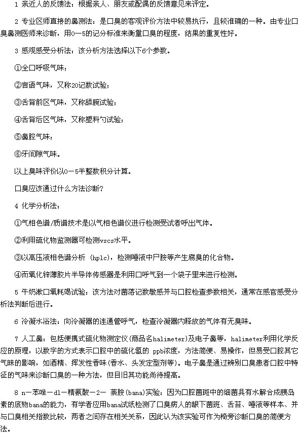 通過怎樣的方法可以診斷口臭這種疾???患有口臭的朋友們一定要重視口臭,因為如果沒有及時進(jìn)行治療的話,病情會很快發(fā)展到更嚴(yán)重的情況,所以為了避免更嚴(yán)重的傷害,一定要早發(fā)現(xiàn)早治療,而且監(jiān)看的人一定要提前預(yù)防。那么通過怎樣的方法可以診斷口臭這種疾病呢?下面醫(yī)學(xué)教育網(wǎng)小編就來為大家介紹一下口臭的診斷方法: