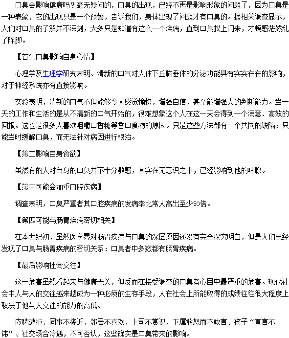 口臭會對生活和身體健康造成五大影響,相信很多人都想知道,為此,醫(yī)學教育網(wǎng)小編特整理了口臭會對生活和身體健康造成五大影響的具體內(nèi)容,供大家參考。