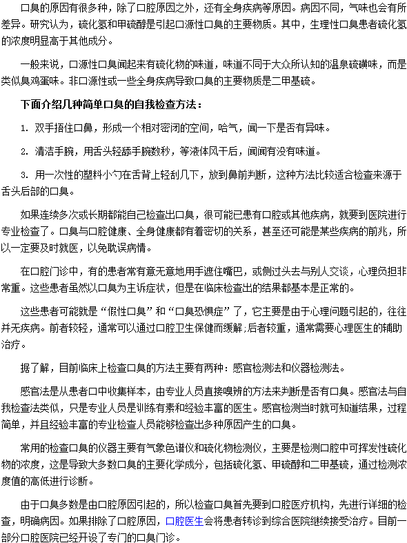 相信很多朋友都很關(guān)注口臭的自我檢查方法有哪些,醫(yī)學(xué)教育網(wǎng)編輯專門為您整理了幾種簡單的口臭自我檢查方法的文章,供您閱讀。