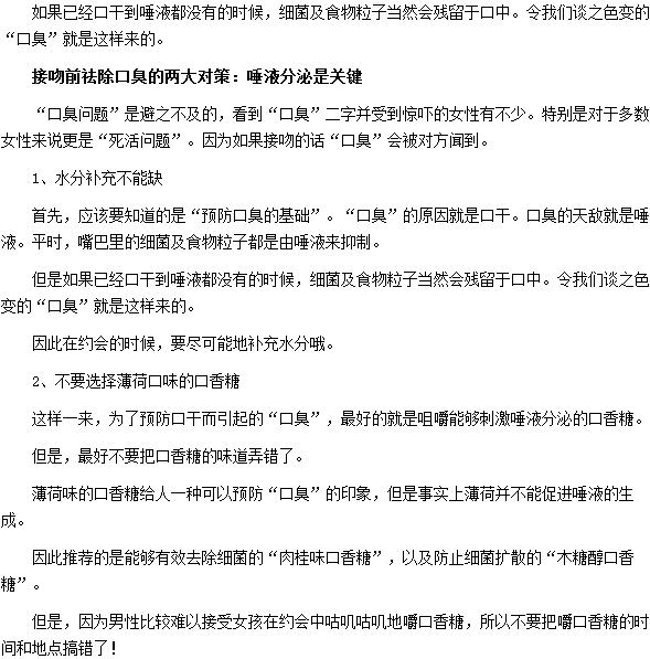 以上就是“接吻前祛除口臭唾液分泌是關(guān)鍵”的相關(guān)文章,相信通過小編的介紹,大家已經(jīng)有所了解,希望能夠幫助到大家。