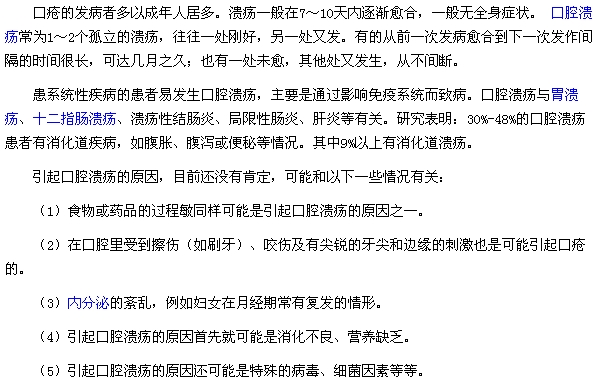 綜上所述,口瘡發(fā)病的原因也是很多很復(fù)雜的,所以大家一定要重視個(gè)人衛(wèi)生問題,同時(shí)還有個(gè)人的免疫功能也需要提高。