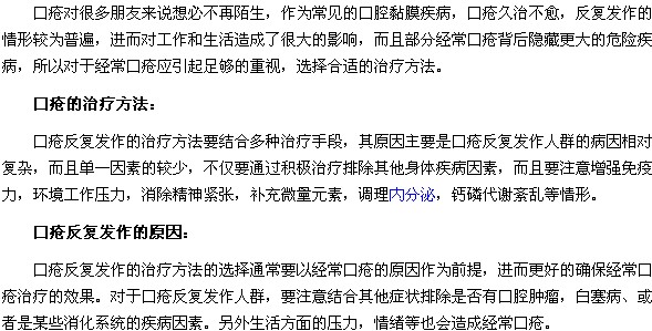 很多患有口瘡的人都想了解口瘡的治療方法及口瘡反復(fù)發(fā)作的原因是什么?為此,醫(yī)學(xué)教育網(wǎng)編輯特別整理了這篇關(guān)于口瘡的治療方法及口瘡反復(fù)發(fā)作的原因的文章,具體如下: