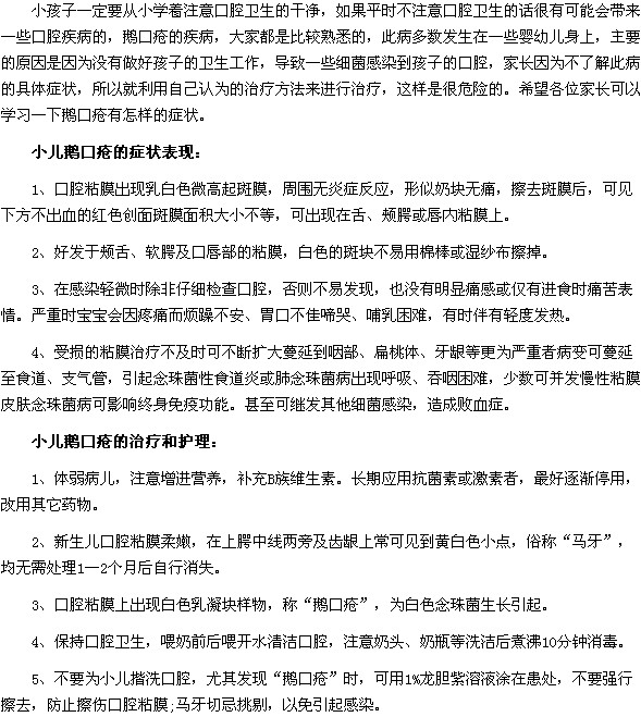通過閱讀以上小編介紹給大家的小兒鵝口瘡的癥狀表現(xiàn)及治療護(hù)理方法后,家長(zhǎng)們對(duì)于小兒鵝口瘡的癥狀表現(xiàn)及治療護(hù)理方法應(yīng)該已經(jīng)了解了,鵝口瘡出現(xiàn)的時(shí)候帶有的癥狀還是比較明顯的,為了孩子的健康著想,家長(zhǎng)們要多多注意孩子的身體變化情況。
