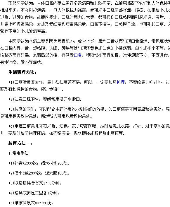 以上就是“小兒口瘡的生活調(diào)理方法及按摩治療小兒口瘡方法”的內(nèi)容,相信大家通過上述文章的閱讀,對小兒口瘡的生活調(diào)理方法及按摩治療小兒口瘡方法已經(jīng)有所了解,希望對大家能夠有所幫助。