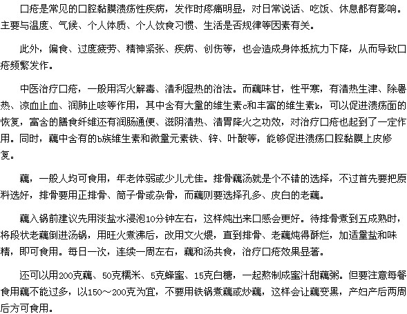 治療口瘡疾病的食療方法是什么?很多患有口瘡又不想吃藥的朋友們一定都特別關(guān)注這個(gè)問題,醫(yī)學(xué)教育網(wǎng)小編就為大家分享一個(gè)治療口瘡疾病的食療方法--排骨藕湯,那么,這道排骨藕湯怎么做呢?下面就讓小編為大家介紹一下吧。