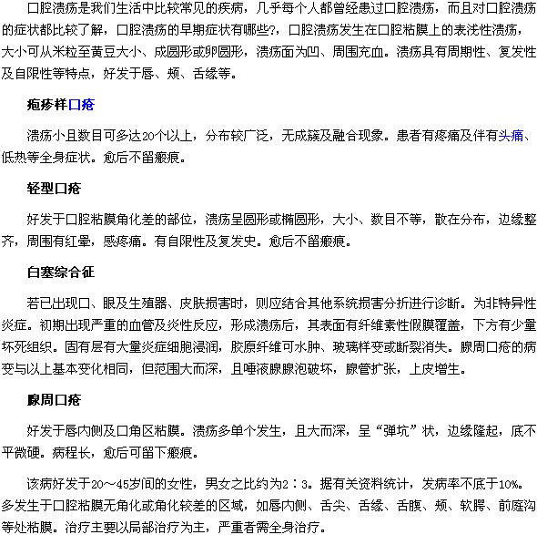 口腔潰瘍的早期癥狀有哪些?相信很多經(jīng)?;伎谳p潰瘍的人都想知道,醫(yī)學(xué)教育網(wǎng)編輯特為您搜集整理了這篇“口腔潰瘍的早期癥狀有哪些?”的文章,供您參考下面就讓小編給大家具體介紹一下吧。
