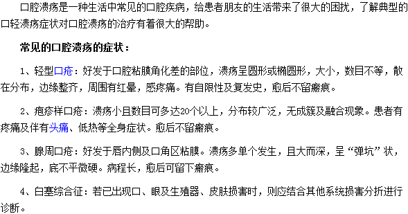 常見(jiàn)的口腔潰瘍的癥狀有哪些?如果您或家人朋友患了口腔潰瘍,相信這篇關(guān)于常見(jiàn)的口腔潰瘍的癥狀的文章會(huì)對(duì)您有幫助。