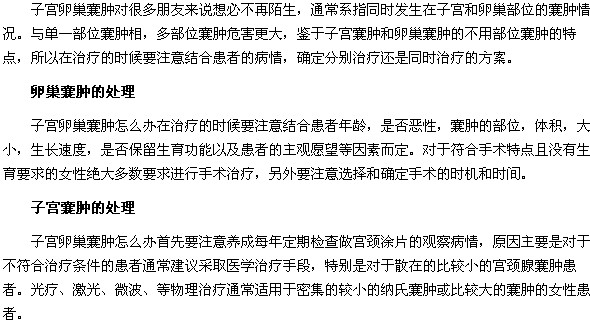 卵巢囊腫與子宮囊腫的處理方法是什么?卵巢囊腫與子宮囊腫如何處理?相信很多人都想知道,那么卵巢囊腫與子宮囊腫的處理方法是什么呢?相信大家看了下面這篇文章就會(huì)明白了。