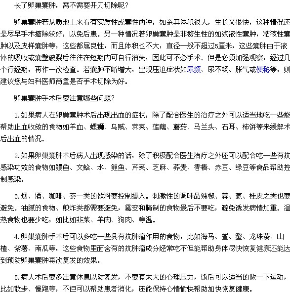 相信很多患有卵巢囊腫的女性朋友都很想知道,什么樣的卵巢囊腫需要開刀切除?手術(shù)后要注意哪些問(wèn)題?醫(yī)學(xué)教育網(wǎng)編輯專門為您整理了“什么樣的卵巢囊腫需要開刀切除?手術(shù)后要注意哪些問(wèn)題?”這篇文章,供您閱讀。