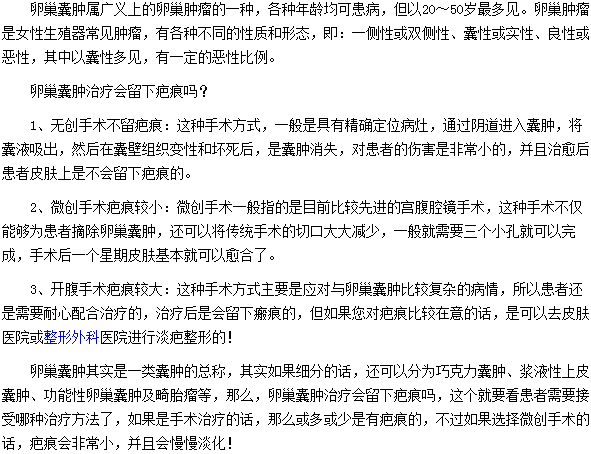 手術(shù)治療卵巢囊腫會留下疤痕嗎?相信很多患有卵巢囊腫的朋友都非常關(guān)注,醫(yī)學(xué)教育網(wǎng)編輯特整理了這篇“手術(shù)治療卵巢囊腫會留下疤痕嗎”的文章,希望能幫助到大家。