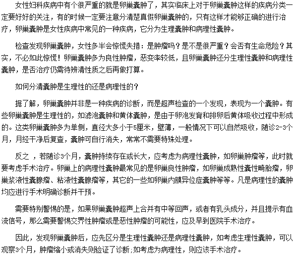 有的時候卵巢囊腫一旦分辨不清楚的話,對于以后的身體傷害還是很大的,特別是要知道是不是生理性的還是病理性的,這樣才能夠更好的判斷一下卵巢囊腫的真假問題,正確的進行治療。以上就是“如何分清卵巢囊腫是生理性的還是病理性的”的內容,相信大家已經了解了,希望對大家能夠有所幫助。
