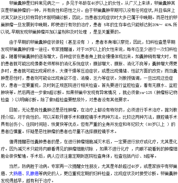 關(guān)于年齡超40的女性切不可對(duì)卵巢囊腫掉以輕心的內(nèi)容,很多人都想知道,醫(yī)學(xué)教育網(wǎng)編輯經(jīng)過(guò)多方搜尋,現(xiàn)將年齡超40的女性切不可對(duì)卵巢囊腫掉以輕心的內(nèi)容分享給大家。
