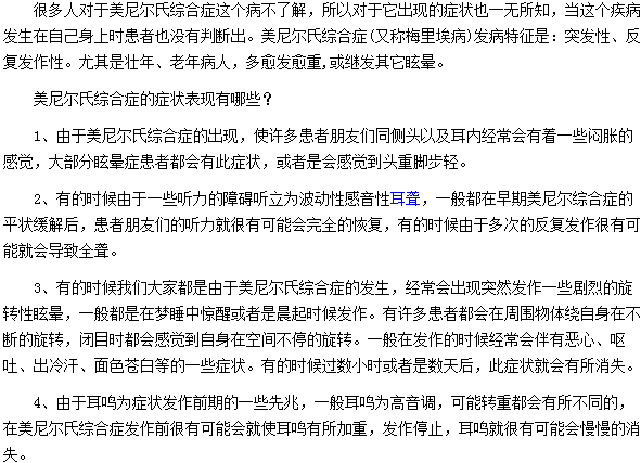 美尼爾氏綜合癥的特征及癥狀表現(xiàn)有哪些?美尼爾氏綜合癥的特征及癥狀表現(xiàn)是什么?相信很多朋友對此都很想了解,下面醫(yī)學(xué)教育網(wǎng)編輯特整理具體內(nèi)容如下: