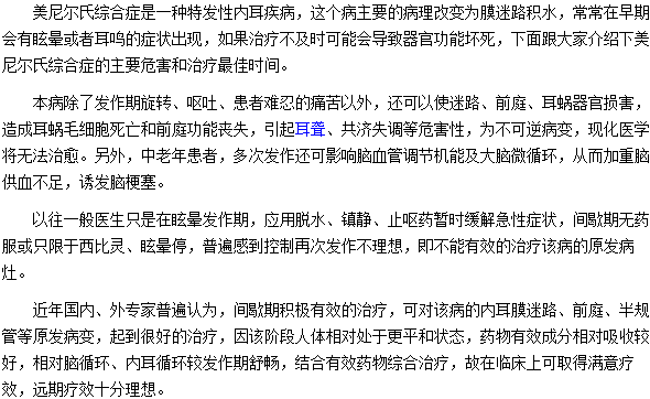以上就是“美尼爾氏綜合癥的危害及最佳治療時(shí)間”的內(nèi)容,相信大家已經(jīng)了解了,在醫(yī)學(xué)上對(duì)于疾病的治療最佳時(shí)間是不會(huì)進(jìn)行討論的,主要是采取早發(fā)現(xiàn)早治療的原則,而美尼爾氏綜合癥屬于例外,希望大家在進(jìn)行此病的治療時(shí)一定要注意選擇好治療的時(shí)間,不要引起疾病的加重。