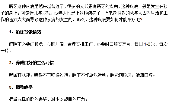 以上文章給我們介紹的就是成年人治療磨牙的辦法了,我們都非常的清楚了,在成年人患有磨牙的時(shí)候,我們不妨試試以上介紹的治療辦法進(jìn)行治療,提醒大家的是,患有磨牙的患者一定要及時(shí)的清理口腔中的細(xì)菌,以防發(fā)生其他的疾病,祝大家身體早日康復(fù)!