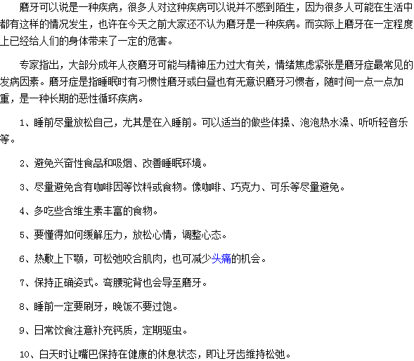 以上是給大家簡單的介紹了日常預(yù)防磨牙的十種小方法,希望這些方法能夠幫助朋友們加深對磨牙的了解。短暫性磨牙可能不會有什么危害,但是如果長期磨牙的話對牙齒帶來的危害也是非常嚴重的。